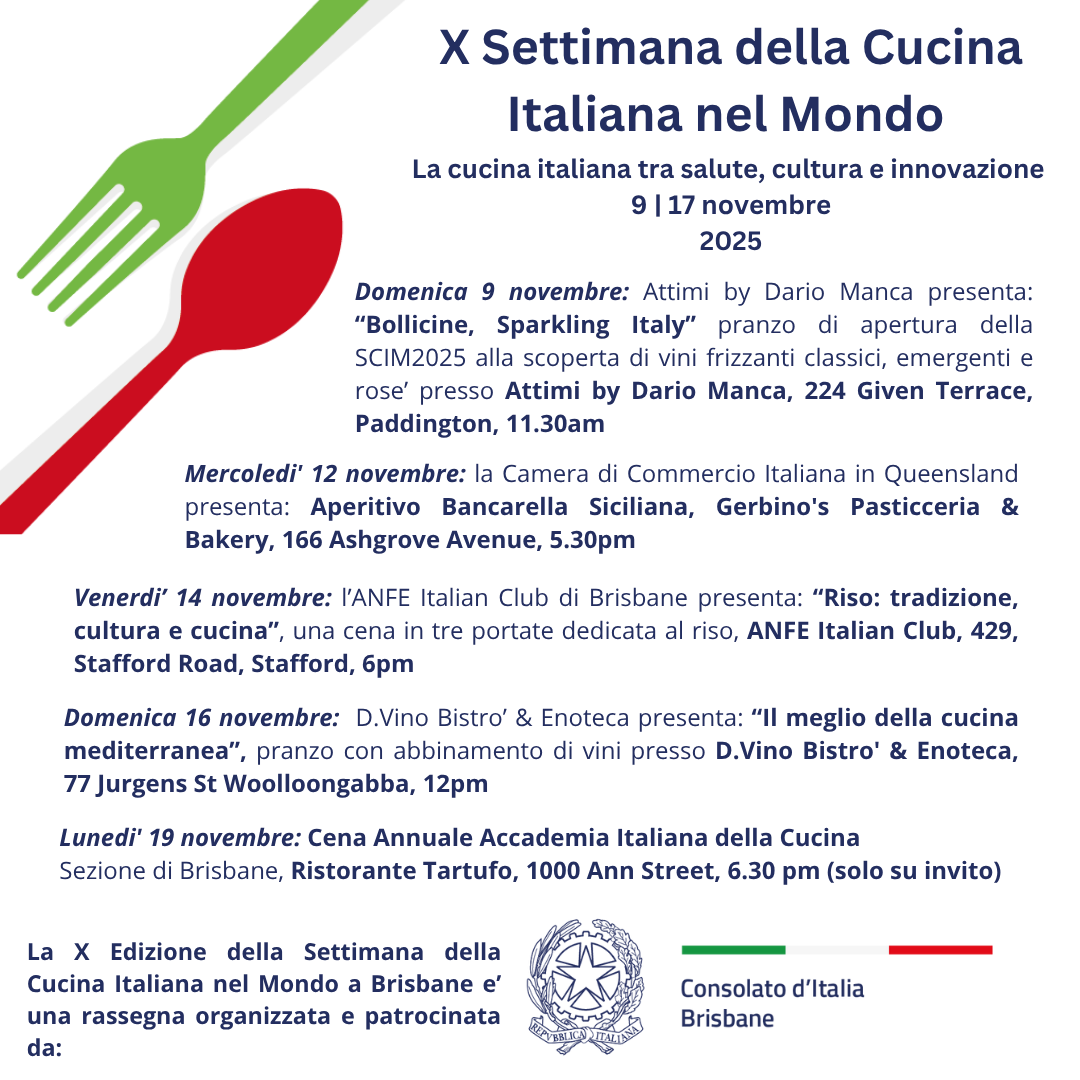 Anche per il 2025 il Consolato d’Italia a Brisbane ha presentato un programma imperdibile in occasione della X Edizione della Settimana della Cucina Italiana nel Mondo!